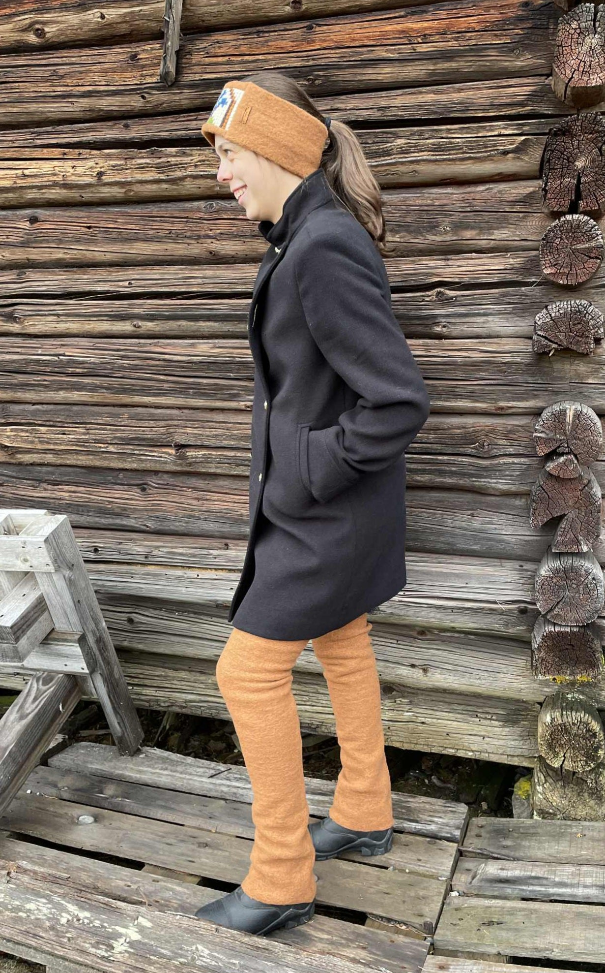 Lekkert pannebånd. Ull og gjenbrukt klokkestreng. One size med stretch. Vask 40 grader eller ullprogram.
