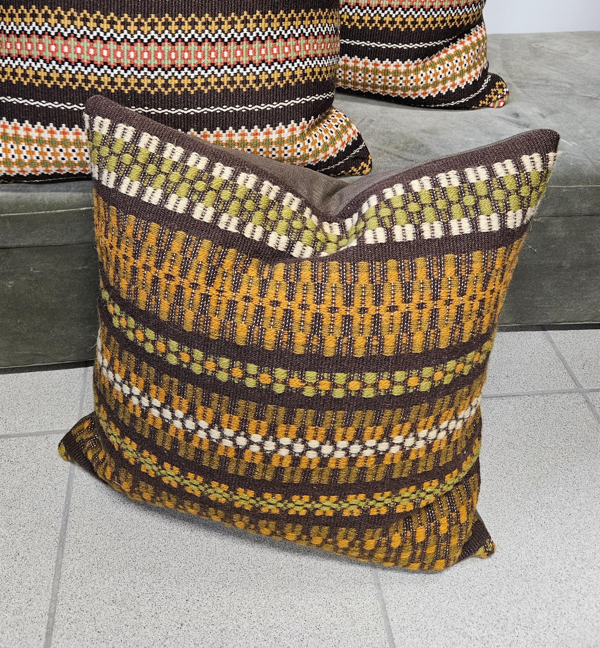 Flott pute i ull str 50x50. Brunt stoff bak som er behagelig å ligge på. Sydd av gammelt åkle som ikke kunne mer. Gjenbruk på sitt beste. Skjult glidelås. Selges med innleggspute fra Norsk dun. Vaskes på ullprogram
